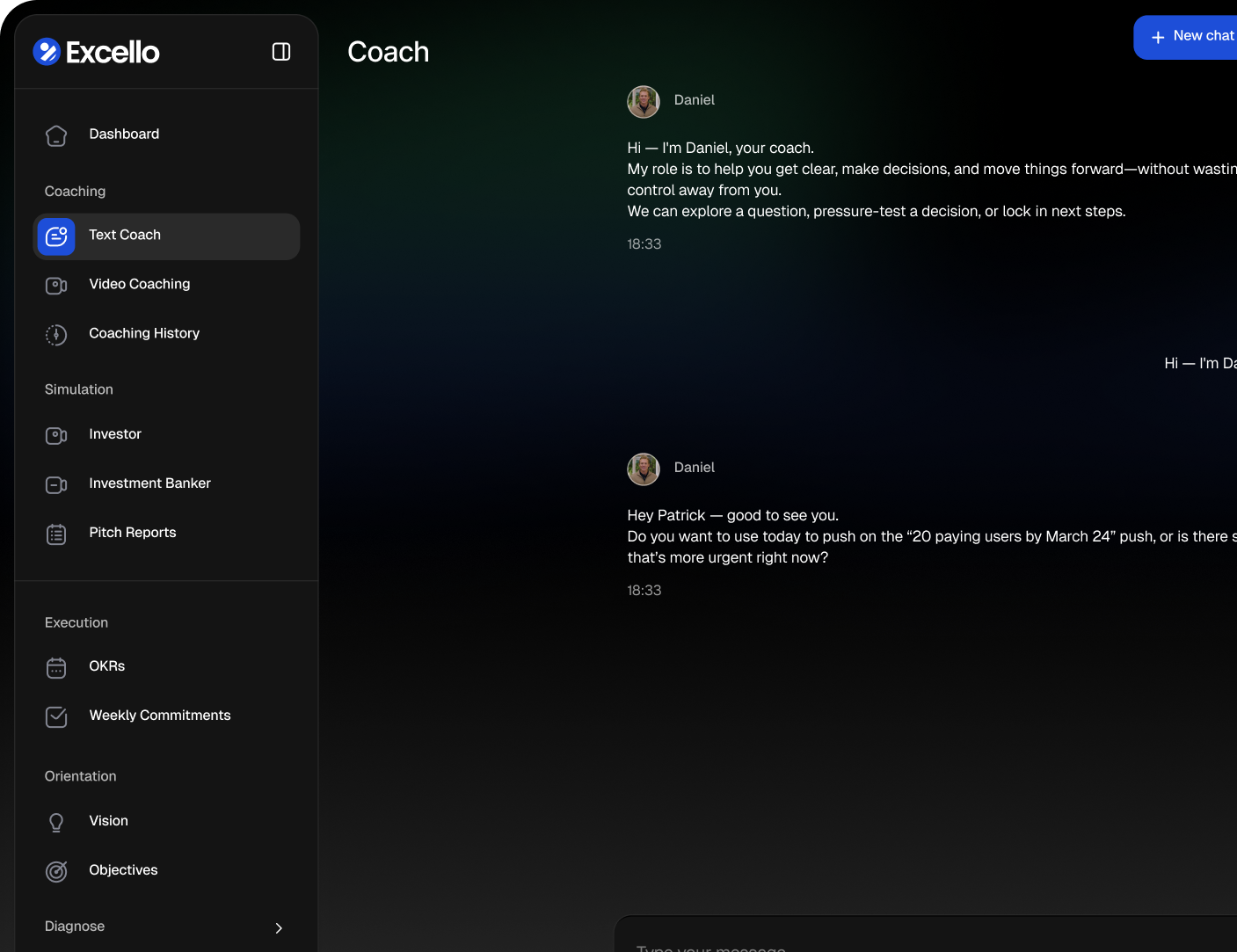 Text when you need to think it through on paper. Video when you need to talk it out. Some decisions crystallize in writing. Others need a conversation. Excello gives you both, 24/7.